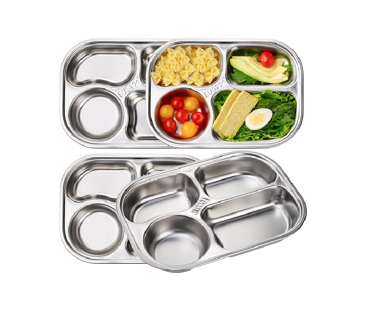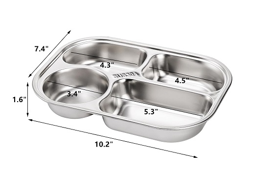 DEAYOU 4 Pack 18/10 Stainless Steel Divided Plate, Small Child Plate with 4-Compartment, Portion Control Serving Platter, Mess Food Sectioned Tray for Dinner, Lunch, Cafeteria, Kids, Adult