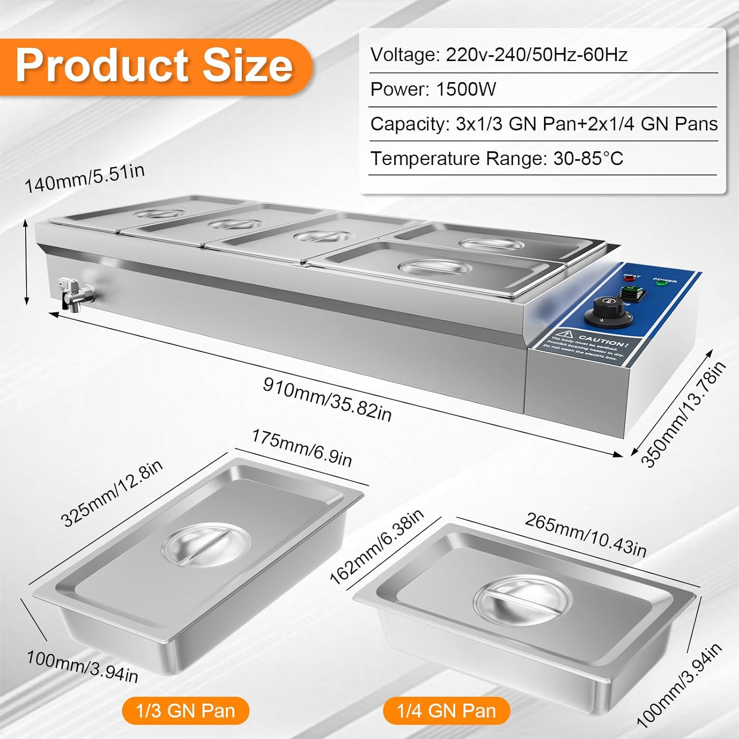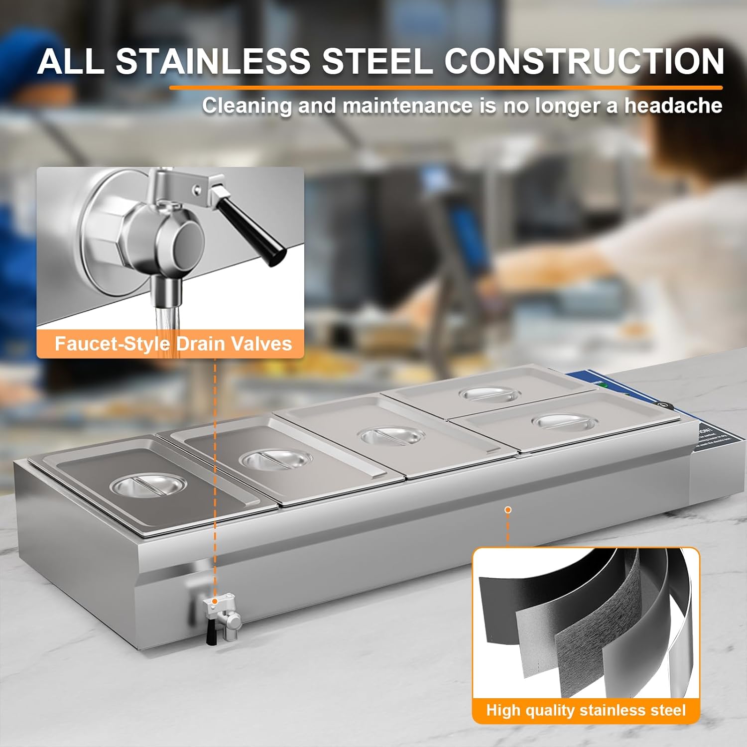 【Excellent Large Capacity Bain Marie】The bain marie comes with 5 large capacity pans, 3 x1/3 GN Pan and 2 small 1/4 GN Pans. Different sizes and capacities to meet your different needs
