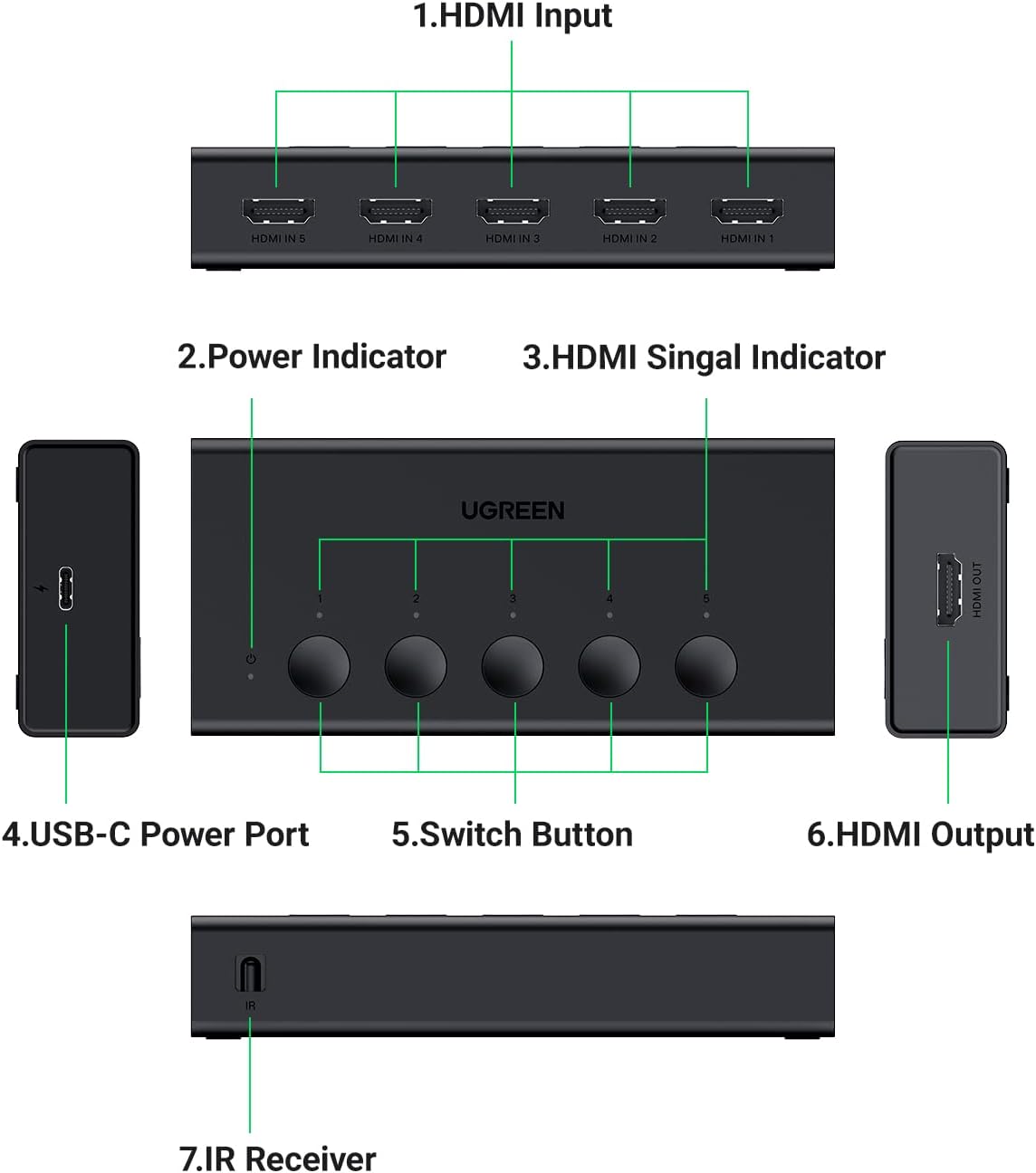Designed for Multiple Gaming Consoles: Are you tired of constantly switching among multiple gaming devices on your TV? UGREEN HDMI Switch 5 in 1 out makes it a breeze! Connect 5 of your favorite gaming devices such as PS5, Xbox, Switch, Roku, and laptop to your TV with just one input port
