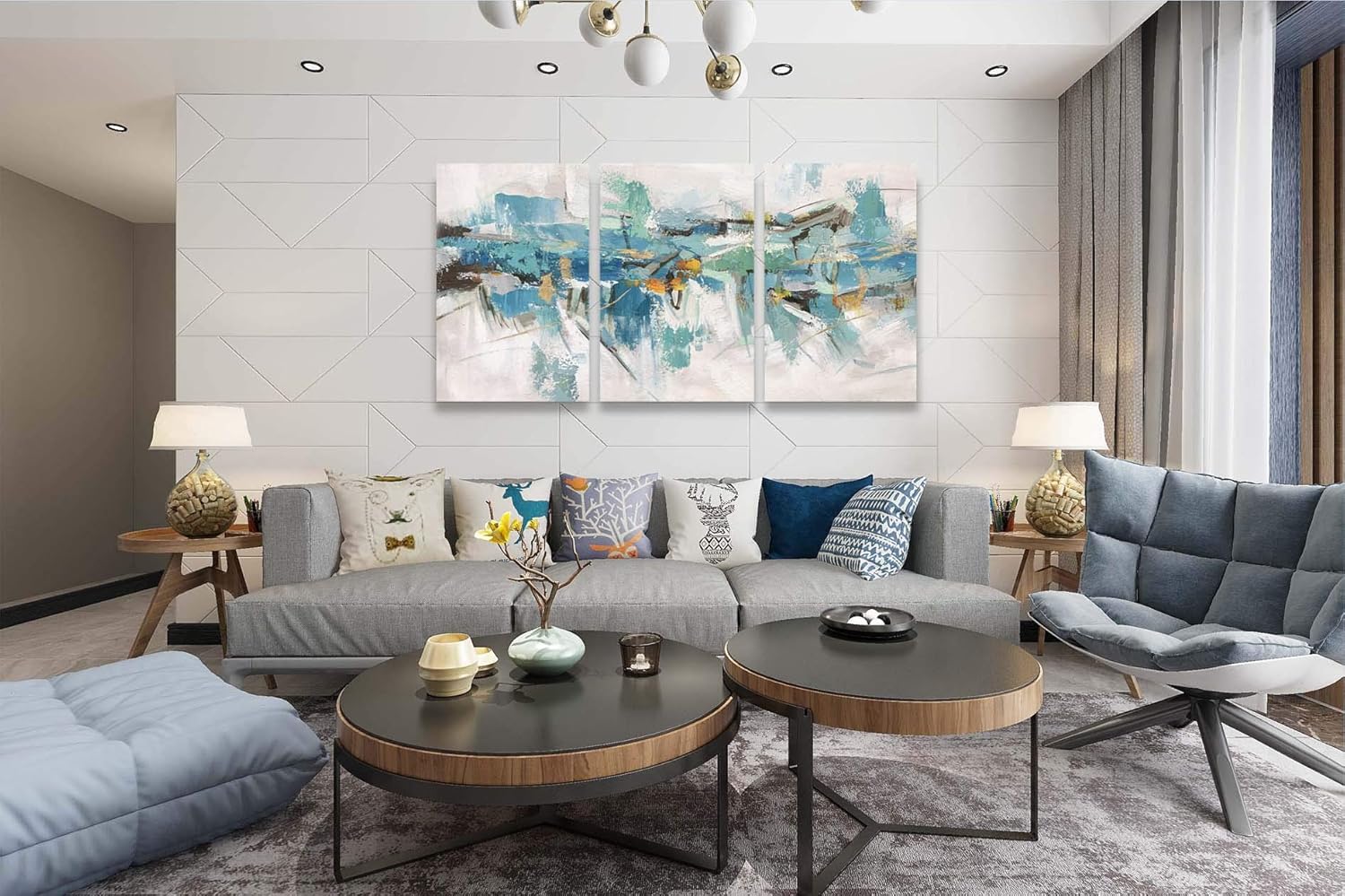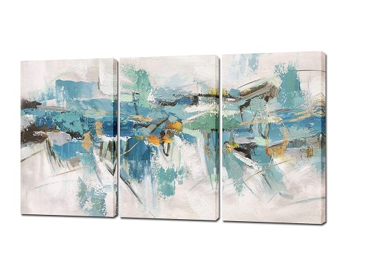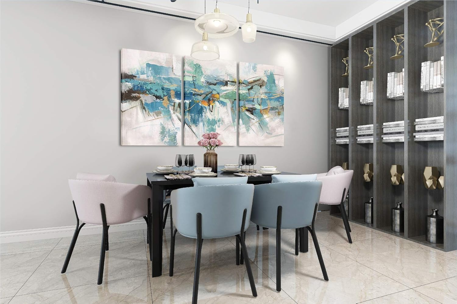 Yihui Arts 3 Piece Abstract Canvas Wall Art with Textured Light Blue Teal Color Painting Pictures Set with Gold Foil Artwork for Living Room Bedroom Bathroom Decor